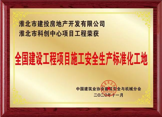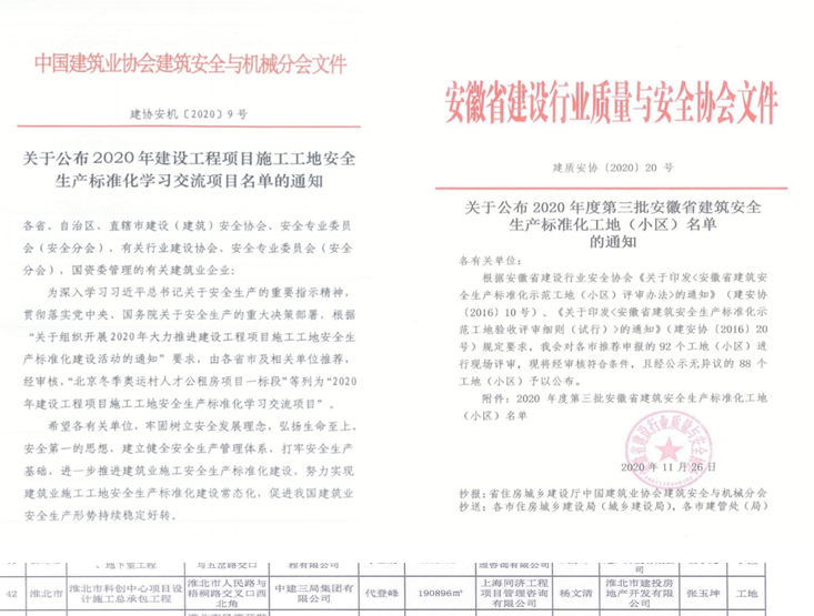 近日, 2020年中國(guó)建筑業(yè)安全生產(chǎn)管理經(jīng)驗(yàn)交流會(huì)在北京舉行。會(huì)上公布了2020年 “全國(guó)建設(shè)工程項(xiàng)目安全生產(chǎn)標(biāo)準(zhǔn)化工地”(全國(guó)AAA級(jí)安全文明標(biāo)準(zhǔn)化工地)名單。 集團(tuán)公司工程部淮北市科創(chuàng)中心項(xiàng)目工程榮獲 “全國(guó)建設(shè)工程項(xiàng)目安全生產(chǎn)標(biāo)準(zhǔn)化工地”榮譽(yù)。