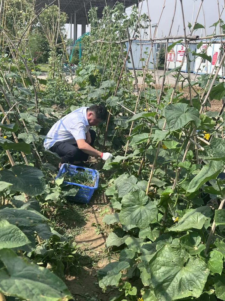 活動現(xiàn)場,天氣雖然炎熱但擋不住黨員勞動的熱情,領取了勞動工具后,分工協(xié)作,按照分配好的耕作區(qū)域開始認真勞作,清理站內綠化草坪并按照要求進行分類投放,清理的雜草作為站內飼養(yǎng)牲畜的飼料,做到物盡其用,采摘下來的蔬菜水果作為食堂食材,不僅豐富了職工的“菜盤子”,還降低了收費站食堂運營成本。