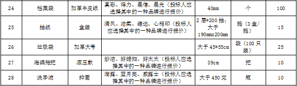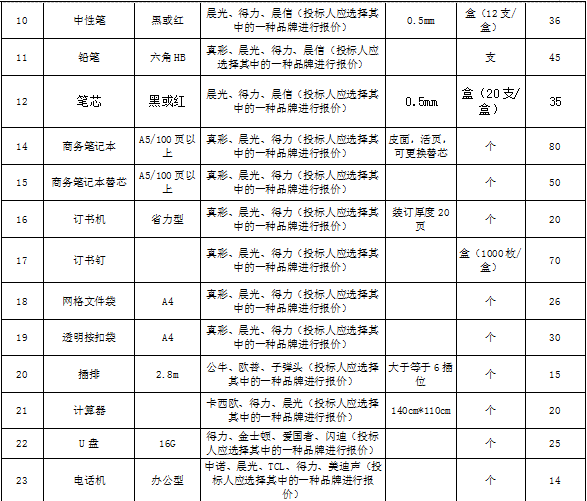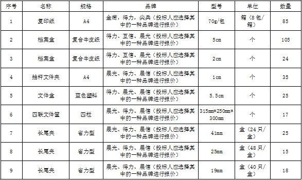 招標(biāo)范圍 | 包括但不限于辦公用品的生產(chǎn)供貨、包裝、運(yùn)輸、檢測(cè)、驗(yàn)收、質(zhì)保及售后服務(wù)等。如有漏項(xiàng)或缺項(xiàng),投標(biāo)人承擔(dān)全部責(zé)任。 | ||||||||||||||||
