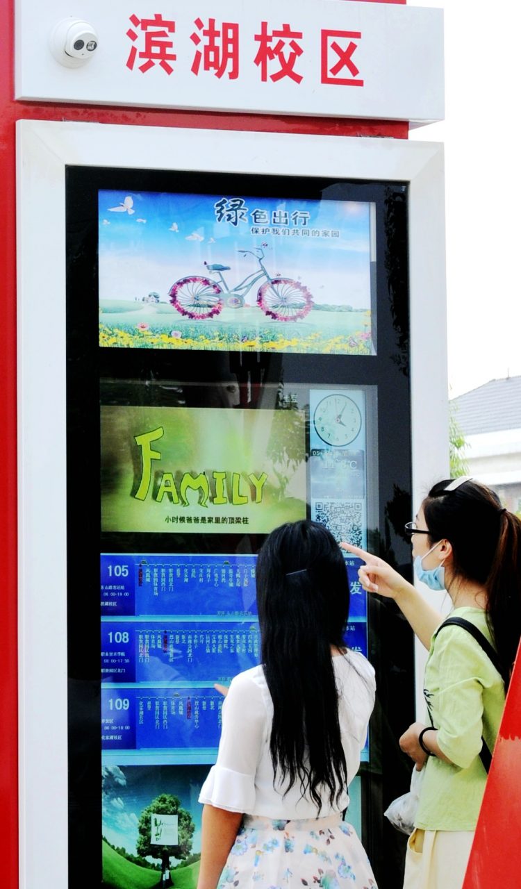 電子公交站牌還沒裝好,就引來了不少大學(xué)生的圍觀。電子站牌采用戶外高亮55寸LCD屏,由號位、視頻、LED屏、公交線路四部分組成,分屏顯示公交車到站信息、視頻廣告、公益宣傳、二維碼掃描、時鐘信息、微信平臺等多種信息,減少市民候車的枯燥,視頻右側(cè)增加了蘋果版和安卓版的“淮北汽運”微信公眾號二維碼,視頻下方,則滾動顯示公交線路的站點、運行時間等詳細信息,電子站牌最下端還可以實時更新當(dāng)天的天氣預(yù)報。同時結(jié)合站牌背面滾動系統(tǒng)可以增加宣傳力度,系統(tǒng)刷新5秒一次,一目了然地看到公交車輛運行的信息,途經(jīng)該站點由哪幾路公交線路,有幾臺車在各線路上運行,各線路那臺車離該站臺近,結(jié)合微信公交讓廣大市民可以做到掐點等車、守時候車。