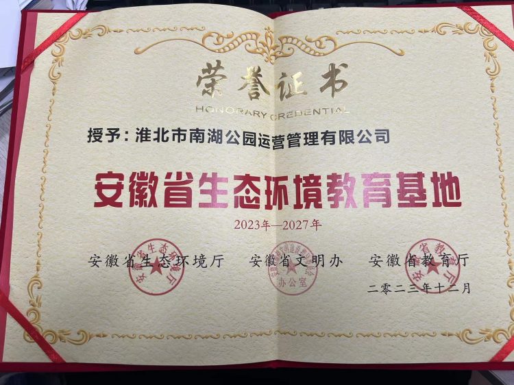 根據(jù)《安徽省生態(tài)環(huán)境廳、安徽省文明辦、安徽省教育廳關(guān)于開展“安徽省生態(tài)環(huán)境教育基地”評選工作的通知》( 皖環(huán)函[2023]852號(hào))要求,經(jīng)各市推薦、資格審核、現(xiàn)場評估、公示等程序,安徽省生態(tài)環(huán)境廳、安徽省文明辦、安徽省教育廳決定命名安徽廬陽董鋪國家濕地公園等 19 家單位為“安徽省生態(tài)環(huán)境教育基地”,南湖公園作為淮北市唯一一家入選“安徽省生態(tài)環(huán)境教育基地”。