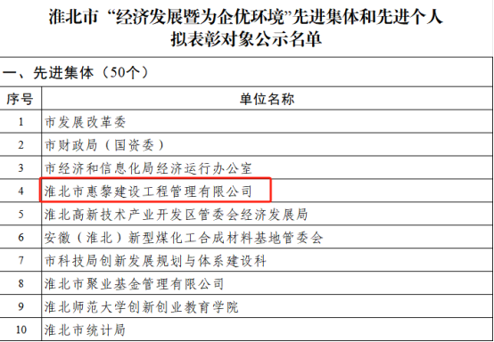 淮北市惠黎建設(shè)工程管理有限公司榮獲淮北市“經(jīng)濟(jì)發(fā)展暨為企優(yōu)環(huán)境”先進(jìn)集體稱(chēng)號(hào)