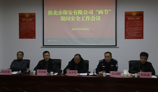 2017年12月10日晚,淮北市保安有限公司在六樓會議室召開“兩節(jié)”期間安全工作會議和講服務(wù)、轉(zhuǎn)作風專項整頓活動啟動儀式,公司領(lǐng)導班子成員及市監(jiān)管支隊政委張如偉同志出席會議。
