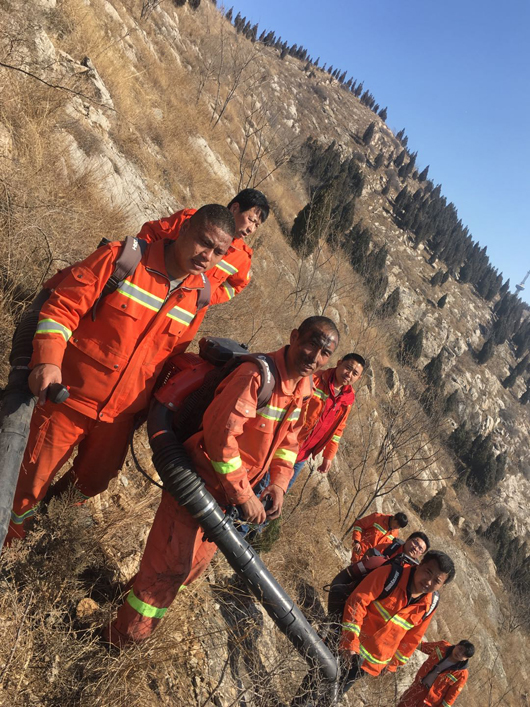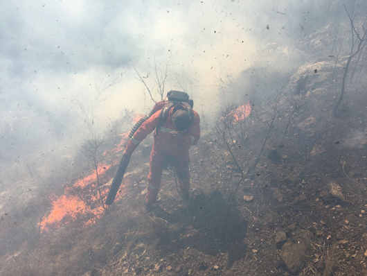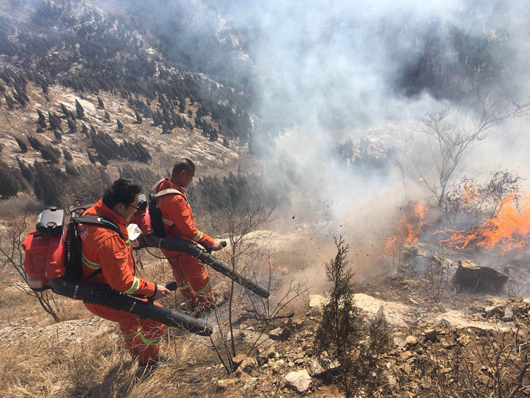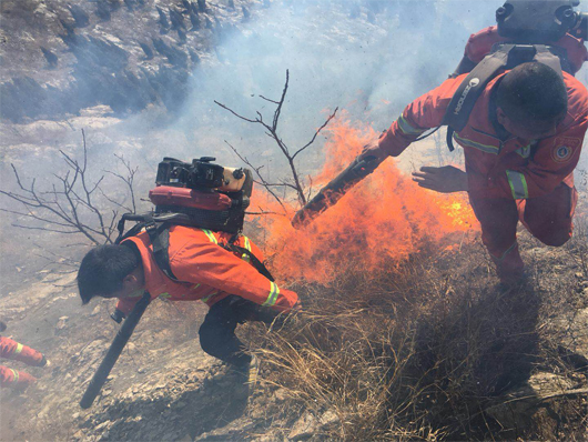 由于火場(chǎng)山體陡峭,碎石、斷坡及帶刺植被較多,大量灌木阻隔而且風(fēng)向飄忽不定,隊(duì)員們行進(jìn)極其困難,護(hù)林隊(duì)員幾次被山火裹入其中,很多隊(duì)員被刺傷和扭傷,但是大家顧不上傷痛,追趕火頭,頑強(qiáng)與火災(zāi)做斗爭(zhēng)。由于現(xiàn)場(chǎng)風(fēng)大火猛煙濃,很多隊(duì)員被熏的眼淚直流,個(gè)別隊(duì)員被火燒焦了眉毛頭發(fā)和衣服,稍不留神就被濃煙和大火困在灌木叢中進(jìn)退不得,就是在這樣惡劣的條件下,大家眾志成城終于把瘋狂的火災(zāi)消滅。