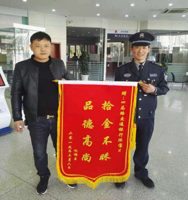 故事發(fā)生在2019年3月4日上午,陳寶生和往常一樣,在交行網(wǎng)點(diǎn)進(jìn)行執(zhí)勤,著突然發(fā)現(xiàn)營業(yè)廳門內(nèi)側(cè)有一個(gè)紅色塑料袋,走近一看,里面物品整齊,來不及多想,老陳手握著塑料袋,下意識(shí)的環(huán)顧了四周,并沒看見失主,是誰不小心把東西都丟在這兒了。鎮(zhèn)定一下之后立即上報(bào)中隊(duì),老陳想包里會(huì)不會(huì)有一些證件之類的東西,或許能找到一些失主的線索也不一定。就和班長一起小心翼翼的打開了袋子,發(fā)現(xiàn)里面都是些合同文件和借條、憑證,價(jià)值等額有200多萬。老陳先把包妥善放好,然后通過調(diào)取監(jiān)控、在網(wǎng)點(diǎn)門口留下信息等方式,積極主動(dòng)尋找失主。功夫不負(fù)有心人終于在下班前與失主倪先生取得聯(lián)系,認(rèn)領(lǐng)物品時(shí)倪先生激動(dòng)的熱淚盈眶,上前緊緊握住了陳寶生的雙手,說:“謝謝……真是太感謝了!我找了好幾天,都是一無所獲,如果這個(gè)包丟失,將造成200多萬元的損失,沒想到遇到了您,讓我說什么好啊!馬上拿出一疊現(xiàn)金送給老陳”