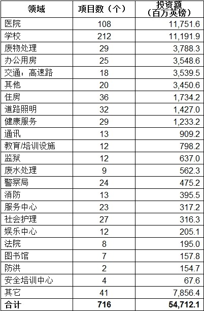 截至2012年3月,在PFI下共有717個(gè)項(xiàng)目,總投資547億英鎊。其中,648個(gè)處于運(yùn)行階段。具體情況見(jiàn)附表。