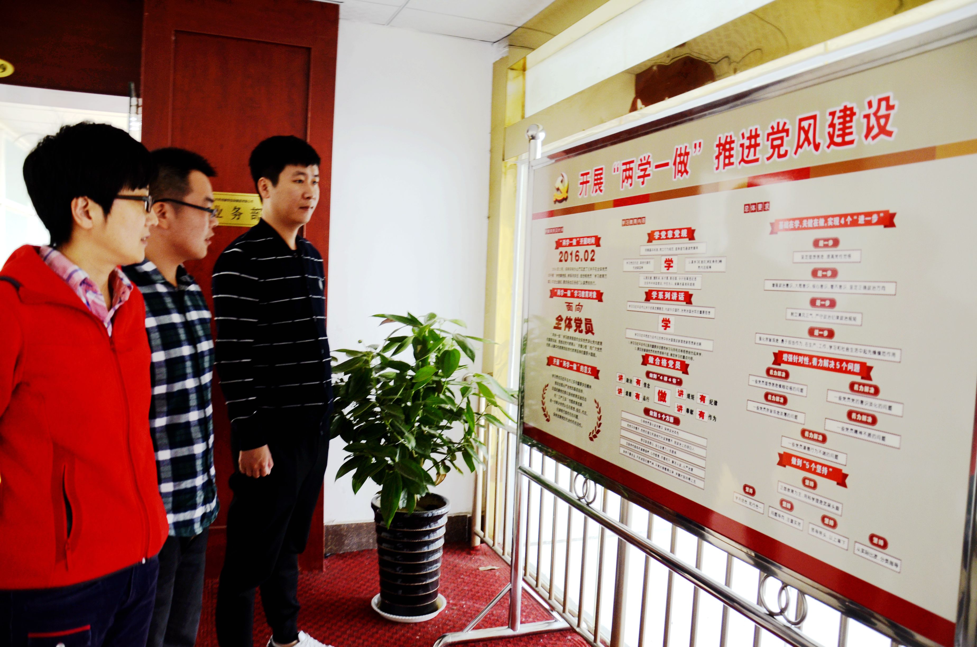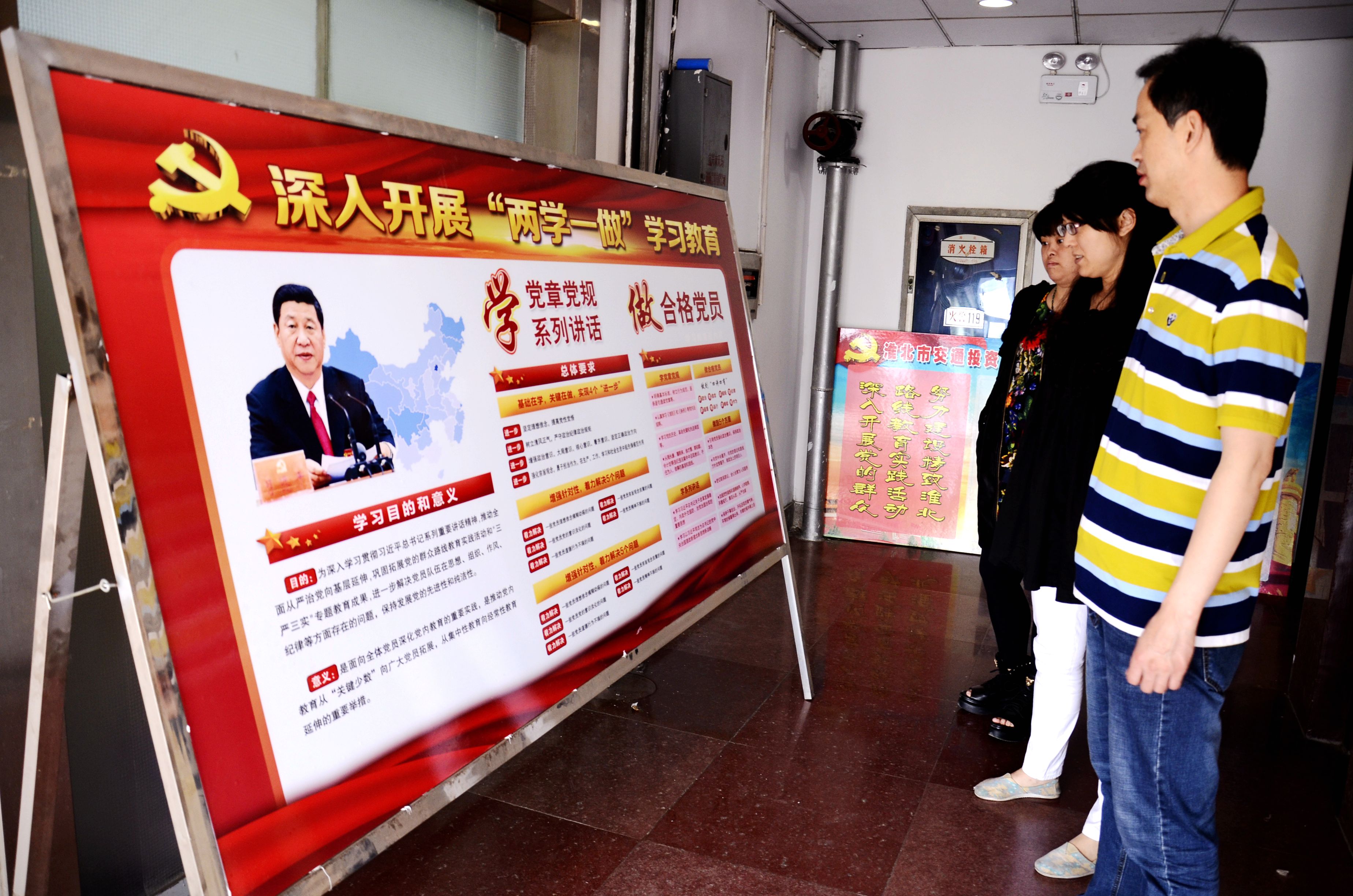 圖為同創(chuàng)集團(tuán)、交投公司、保安公司的 員工在觀看 兩學(xué)一做學(xué)習(xí)教育展板。